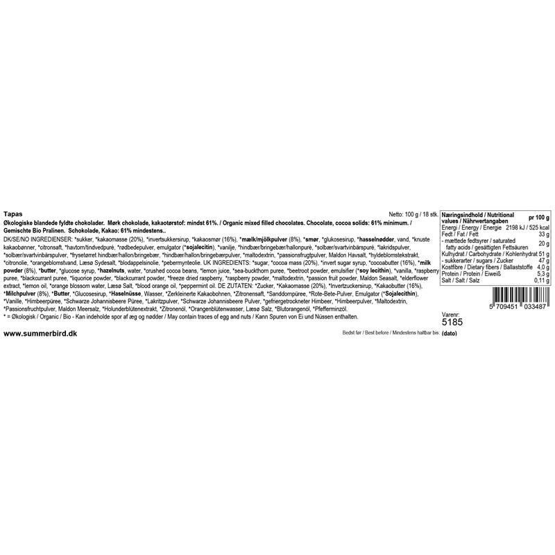 Deres succesfulde Tapas-gaveæske indeholder flere varianter af 18 små elegante stykker fyldte chokolader. Æsken byder på en verden af velsmag i form af blandt andet praliné, hindbær, mynte og passion.
