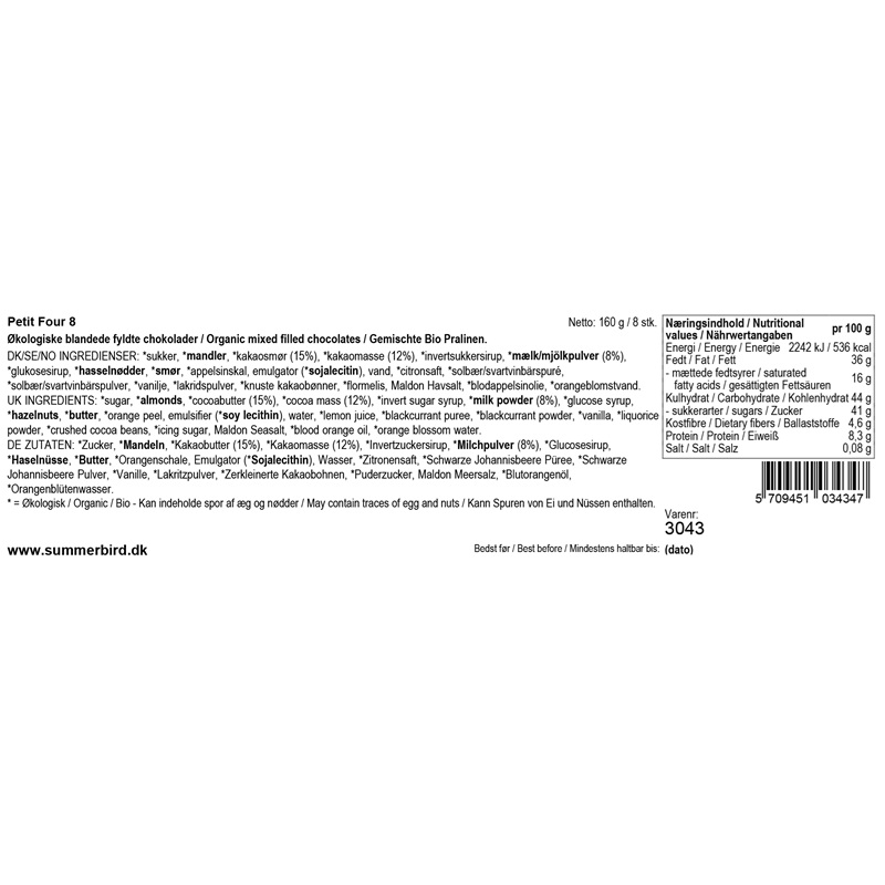 Gaveæsken indeholder 8 forskellige varianter af Summerbird’s ikoniske Petit Four-stykker, der byder på en verden af velsmag i form af marcipan på stenvalsede middelhavsmandler, syltet orangeskal, karamel, lakrids, solbær eller praliné kombineret med deres chokolader.