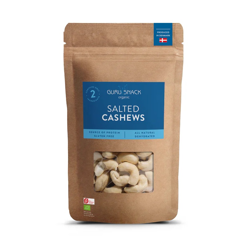 Guru Snack Salted Cashews – en hyldest til nøddekunst og økologisk udsøgthed. Oplev den rene nøddeglæde og tilføj et strejf af elegance til dine smagsoplevelser i dag!
