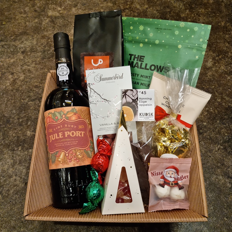 Julekurv med jule portvin, kaffe og snolder