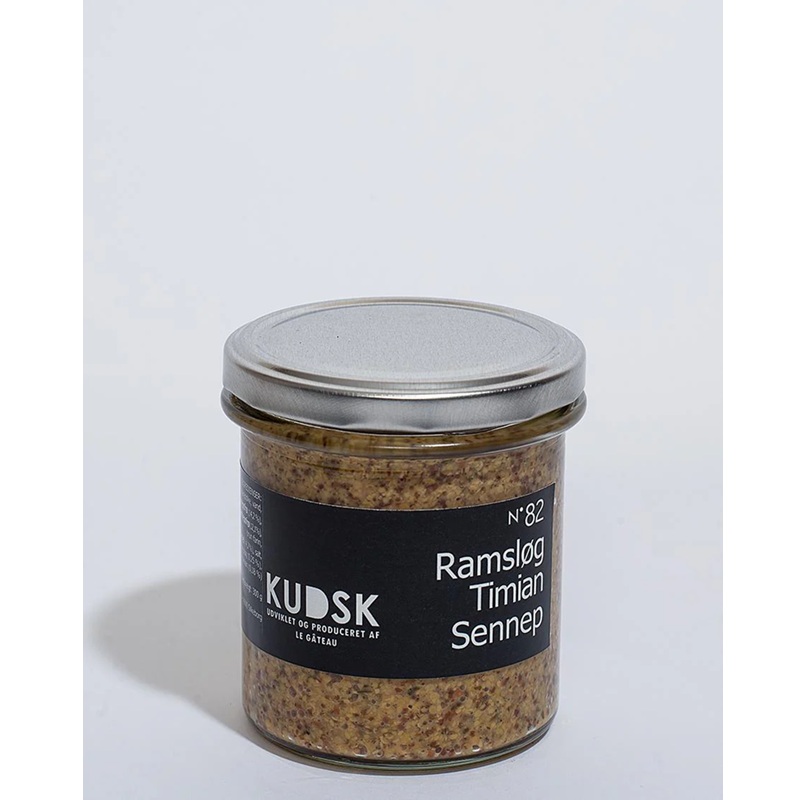 KUDSK Ramsløg timian sennep, fremstillet af gule og brune knuste sennepsfrø og tørret urter.