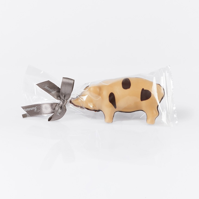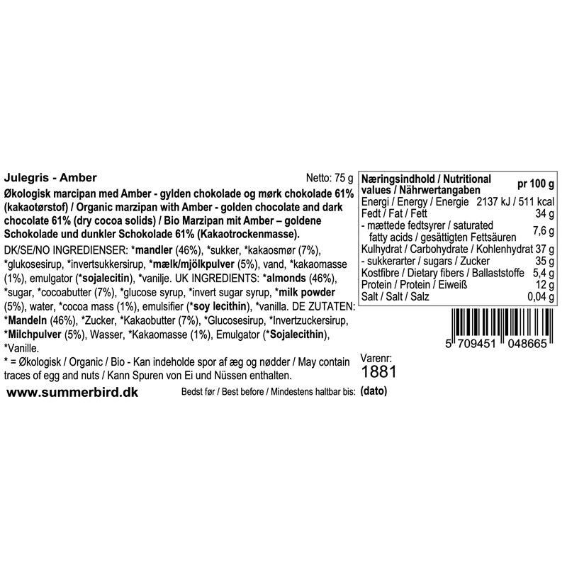 Julegris af ren marcipan, lavet på stenvalsede middelhavsmandler, overtrukket med deres prisvindende og populære Amber Classic-chokolade og afslutningsvist dekoreret med mørk chokolade Amazonas 61%.