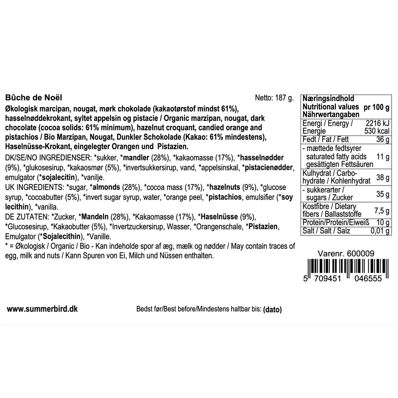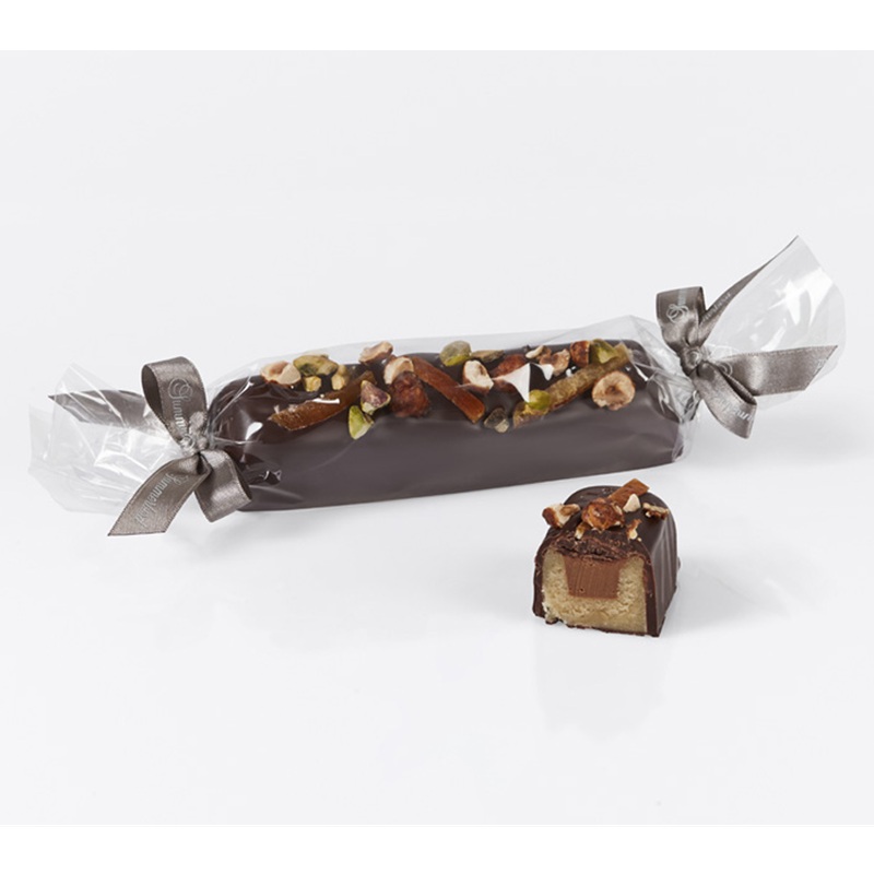 Raffineret og klassisk julebrød på marcipan af stenvalsede middelhavsmandler og nougat, der er overtrukket med deres stenvalsede mørke chokolade Arriba Nacional 68%, baseret på kakaobønnen Arriba Nacional, der vokser langs Guayas-floden i Ecuador og anses for at være blandt de fineste i verden. Smagsprofilen er frugtig med noter af solmodne bær og vanilje. Afslutningsvist dekoreres julebrødet med knust krokant af piemonte hasselnødder, kandiseret skal af solmodne spanske appelsiner samt pistacie. Et julebrød i særklasse hvor håndværk, råvaren og enkeltheden er i centrum.