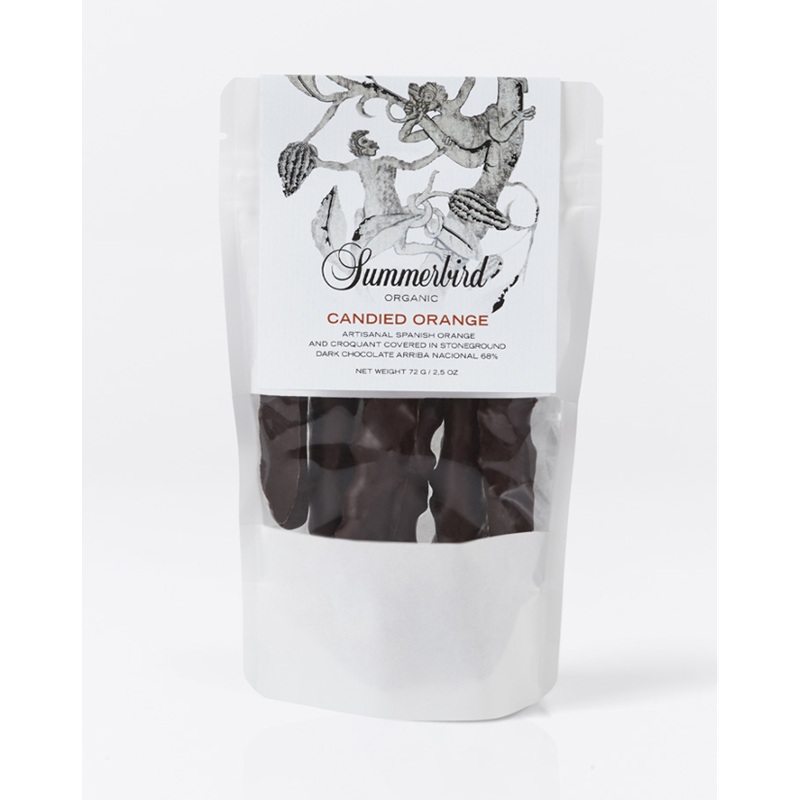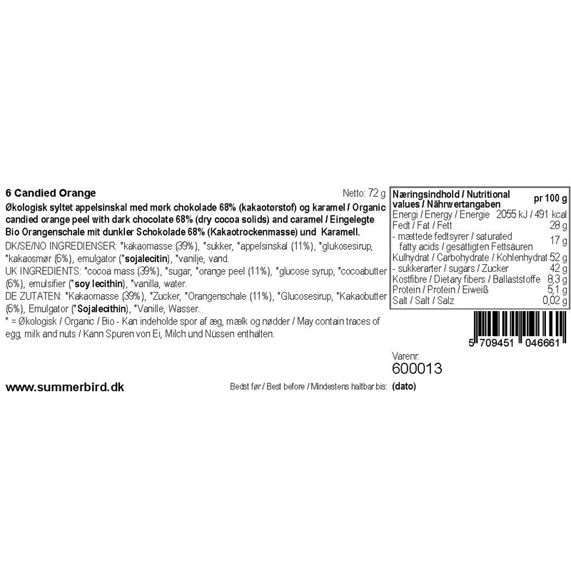 Kandiseret skal af solmodne økologiske appelsiner fra Spanien, overtrukket med et tykt lag mørk chokolade Arriba Nacional 68% og knust karamel.