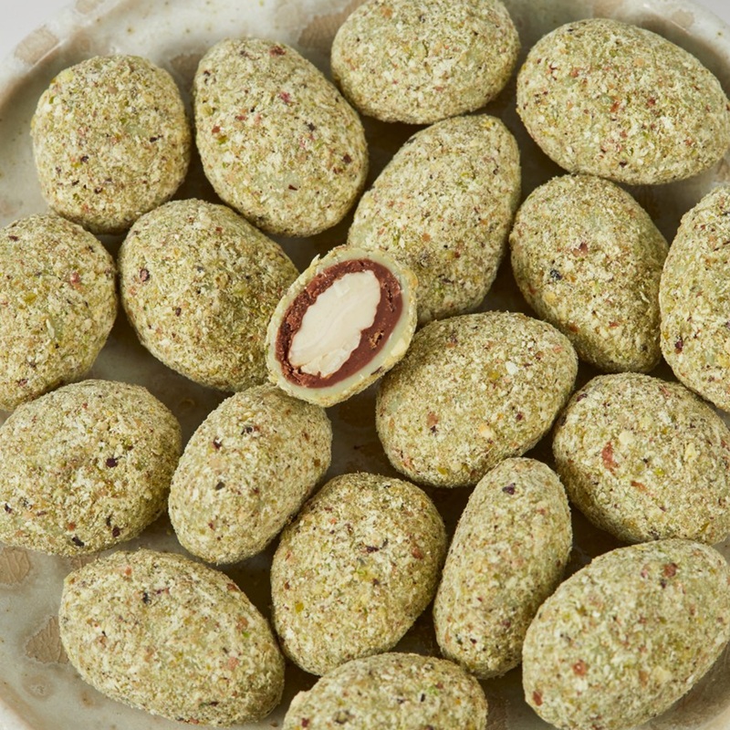 Let ristede spanske mandler, praliné, mørk chokolade Amazonas 61%, hvid chokolade og revet pistacie.