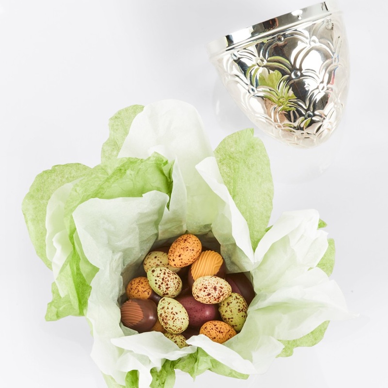 Det ikoniske sølvæg er både en påsketradition og kærlig forårsgave, fyldt med fine hånddekorerede, økologiske chokoladeæg i smukke farver og med skønne fyldninger.