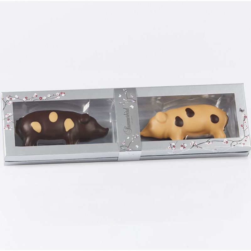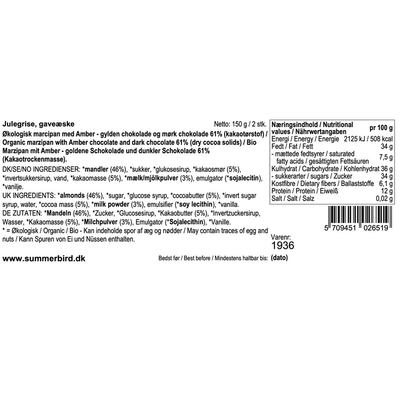To klassiske julegrise af ren marcipan, lavet på stenvalsede middelhavsmandler. Den ene er overtrukket med deres prisvindende og populære Amber Classic-chokolade og den anden med et tykt lag frugtig, mørk chokolade Amazonas 61%.