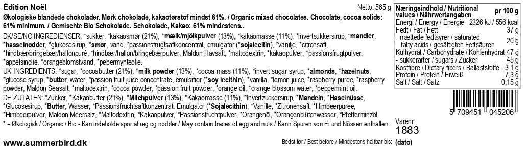 Édition Noël er fyldt med vores ikoniske Summerbirds, raffinerede chokoladebarer, marcipan af stenvalsede middelhavsmandler overtrukket med mørk chokolade Amazonas 61 % og smagfulde, fyldte chokolader. Bag hver låge gemmer sig 2 stykker chokolade. Édition Noël indeholder 12 forskellige varianter.