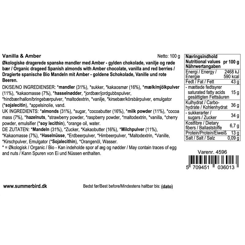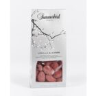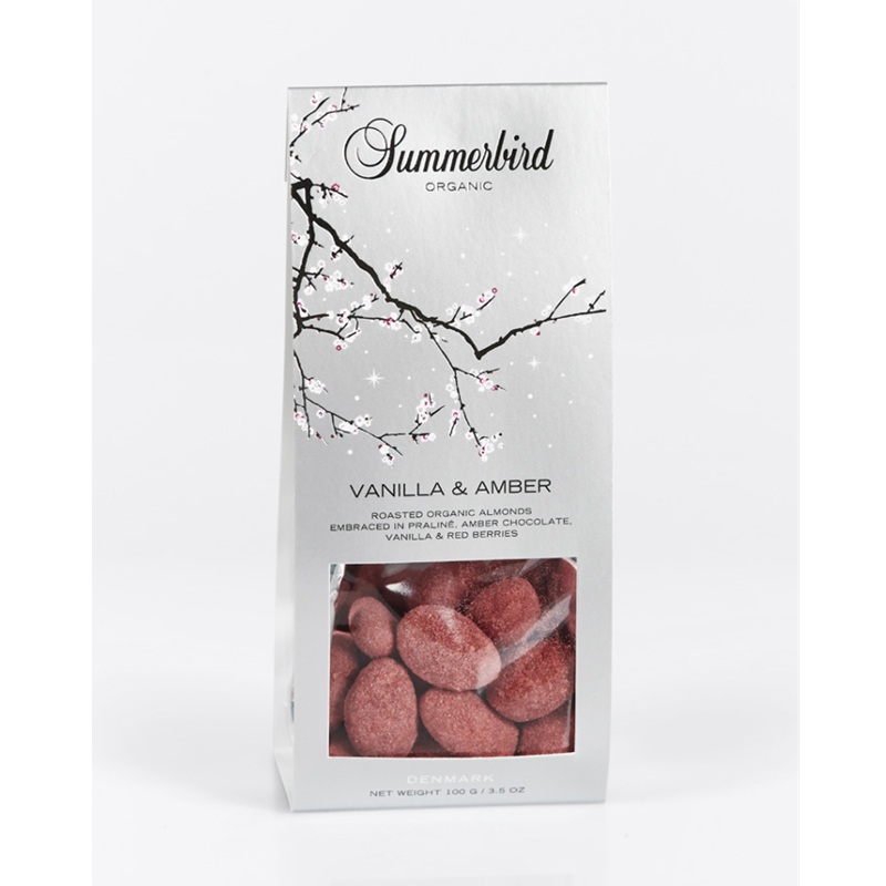 Let ristede spanske mandler drageret i praliné og krokant. Overtrukket med et tykt lag af deres prisvindende Amber Classic-chokolade og afslutningsvis vendt i det fineste pulver af røde bær og rigelige mængder vanilje. Harmoniske og unikke mandler med konsistens og frugtighed