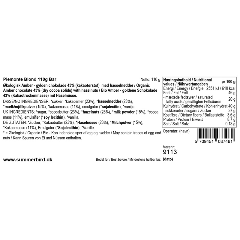En chokoladebar, baseret på Amber Blond, som er deres fortolkning af den klassiske mælkechokolade og drysset med let ristede økologiske Piemonte-hasselnødder. En sublim smagsoplevelse med fine noter af frisk mælk, karamel, vanilje fra chokoladen og umami fra de sprøde Piemonte-hasselnødder.