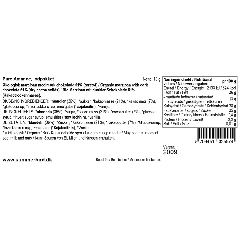 Deres ikoniske sommerfugl, Pure Amande blev skabt i 1986. Deres Summerbird blev et nybrud i chokoladeverdenen og starten på Summerbird Organic. Filosofien var dengang som nu at skabe den fuldendte chokolade, baseret på de bedste ingredienser fra naturen. Opskriften på Summerbirden er enkel: ren marcipan af stenvalsede middelhavsmandler, overtrukket med deres mørke chokolade Amazonas 61 %. En perfekt kombination, hvor mandelsmagen og de fine florale noter i den saftige marcipan fremhæves af den frugtige mørke chokolade.
