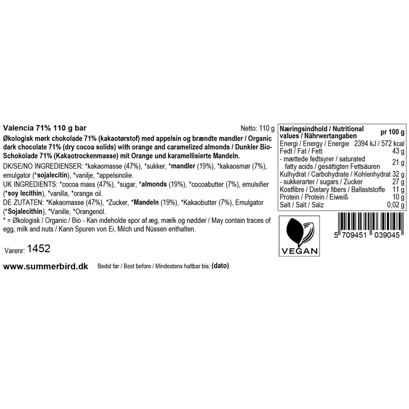 En mørk chokoladebar, let parfumeret med orange, drysset med karamelliserede økologiske spanske mandler og baseret på deres mørke chokolade Guayas 71 % af kakaobønnen Arriba Nacional, der vokser langs Guayas-floden i Ecuador og anses for at være blandt de fineste i verden. En dyb og kraftfuld chokoladebar med en sprød tekstur.
