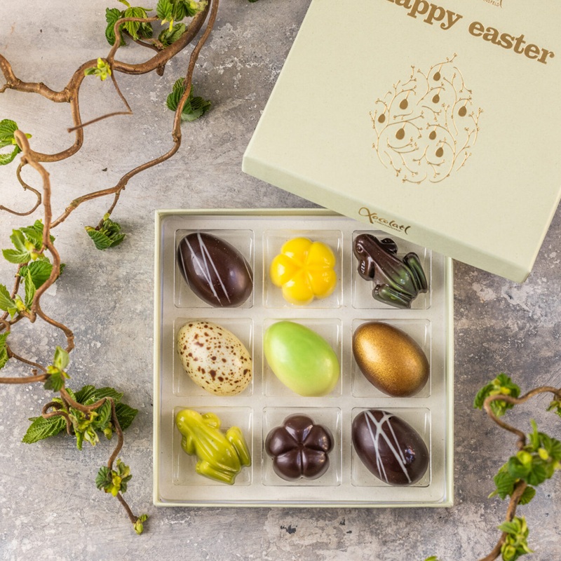 Grøn gaveæske med 9 fyldte chokolader. Skønne smagsvarianter som lakrids, yuzu, flødekaramel, mint, citron, saltkaramel, marcipan og nougat
