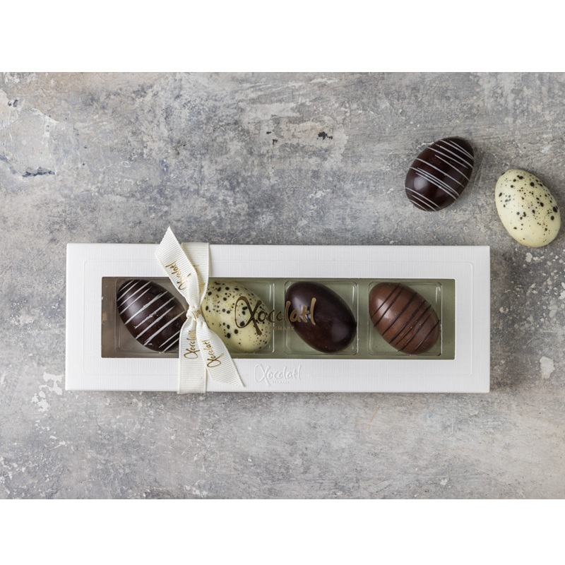 Gaveæske med 4 maxi marcipanæg. Marcipan med solbær og mørk chokolade, marcipan med hvid chokolade og lakrids, ren klassisk marcipan med mørk chokolade og citronmarcipan med mælkechokolade