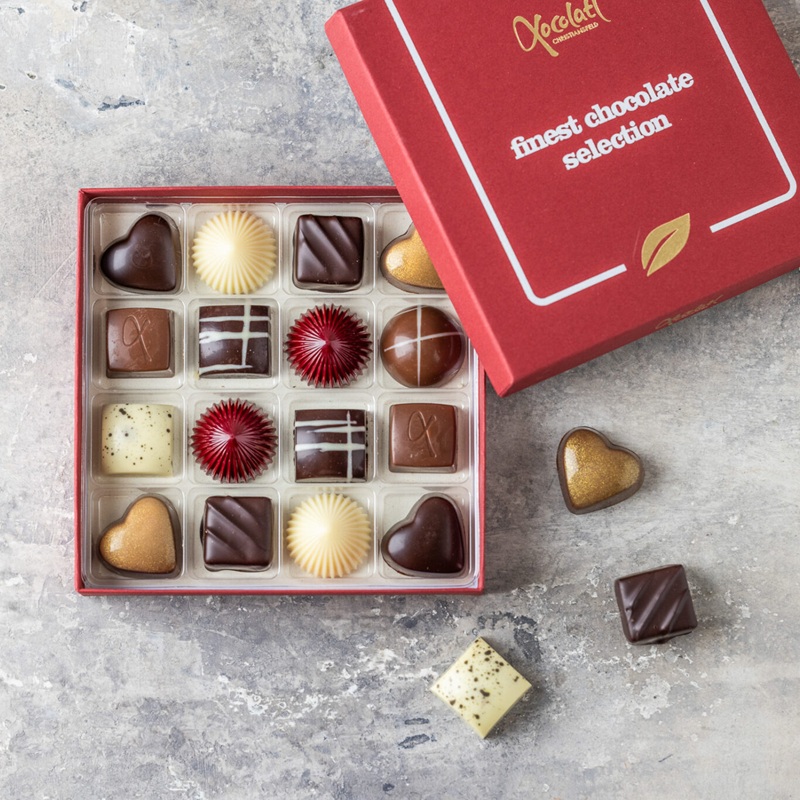 Rød lukket gaveæske med 16 fyldte chokolader. Forskellige smagsvarianter som citron, appelsin, hasselnød, nougat, marcipan, lakrids, saltkaramel, kahlua og rom.