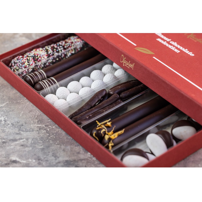 Super fin rød lukket gaveæske med snebolde, orangegrene, sprøde dronningemandler med mørk chokolade, mint poletter, 2 rene marcipanstænger med mørk chokolade og 2 marcipanstænger med cognac.